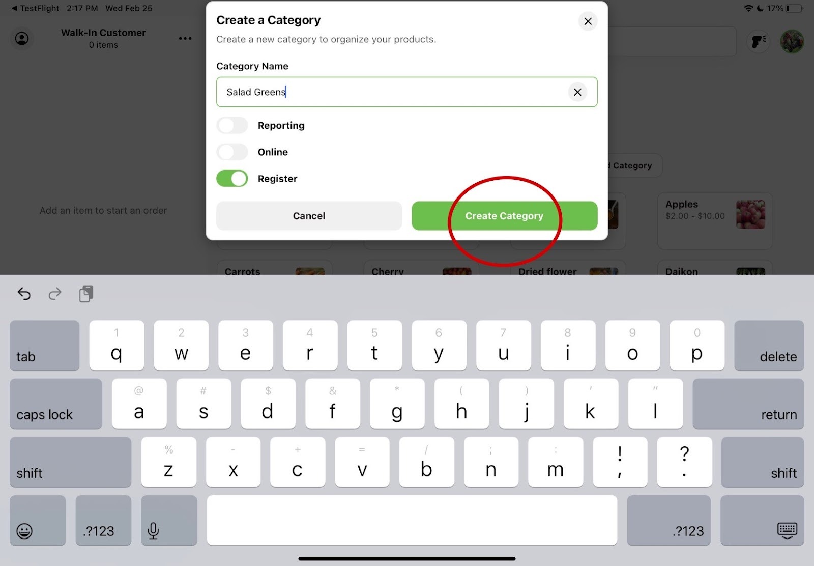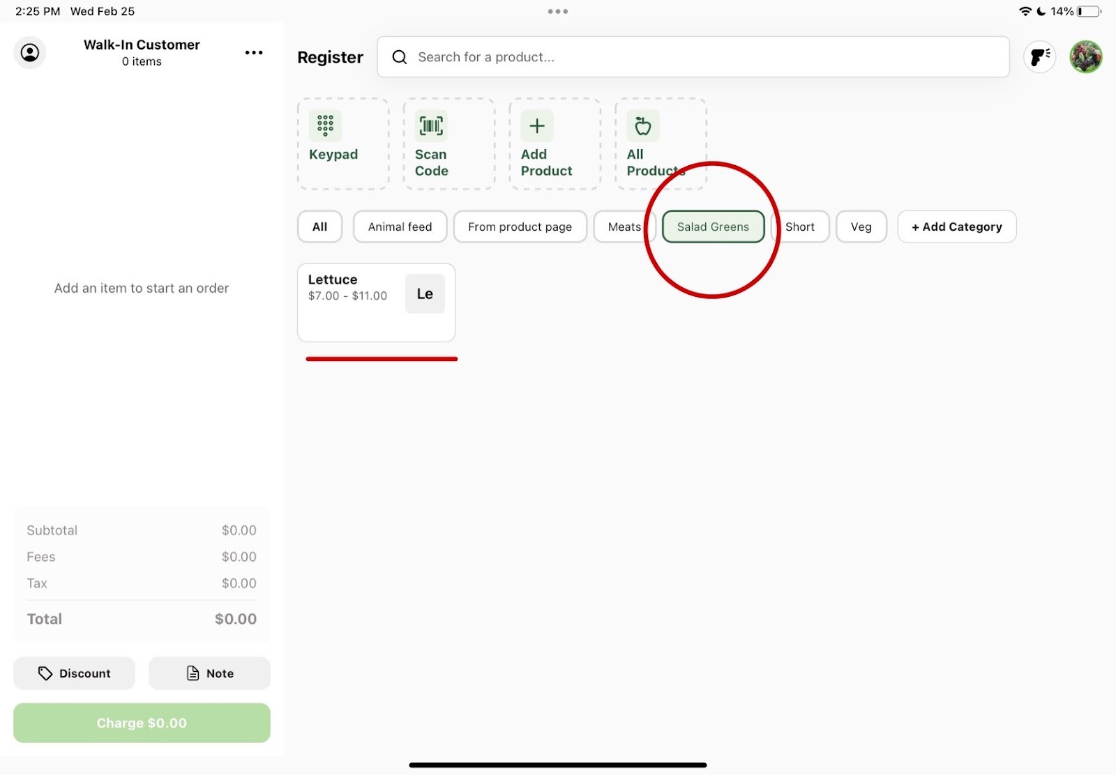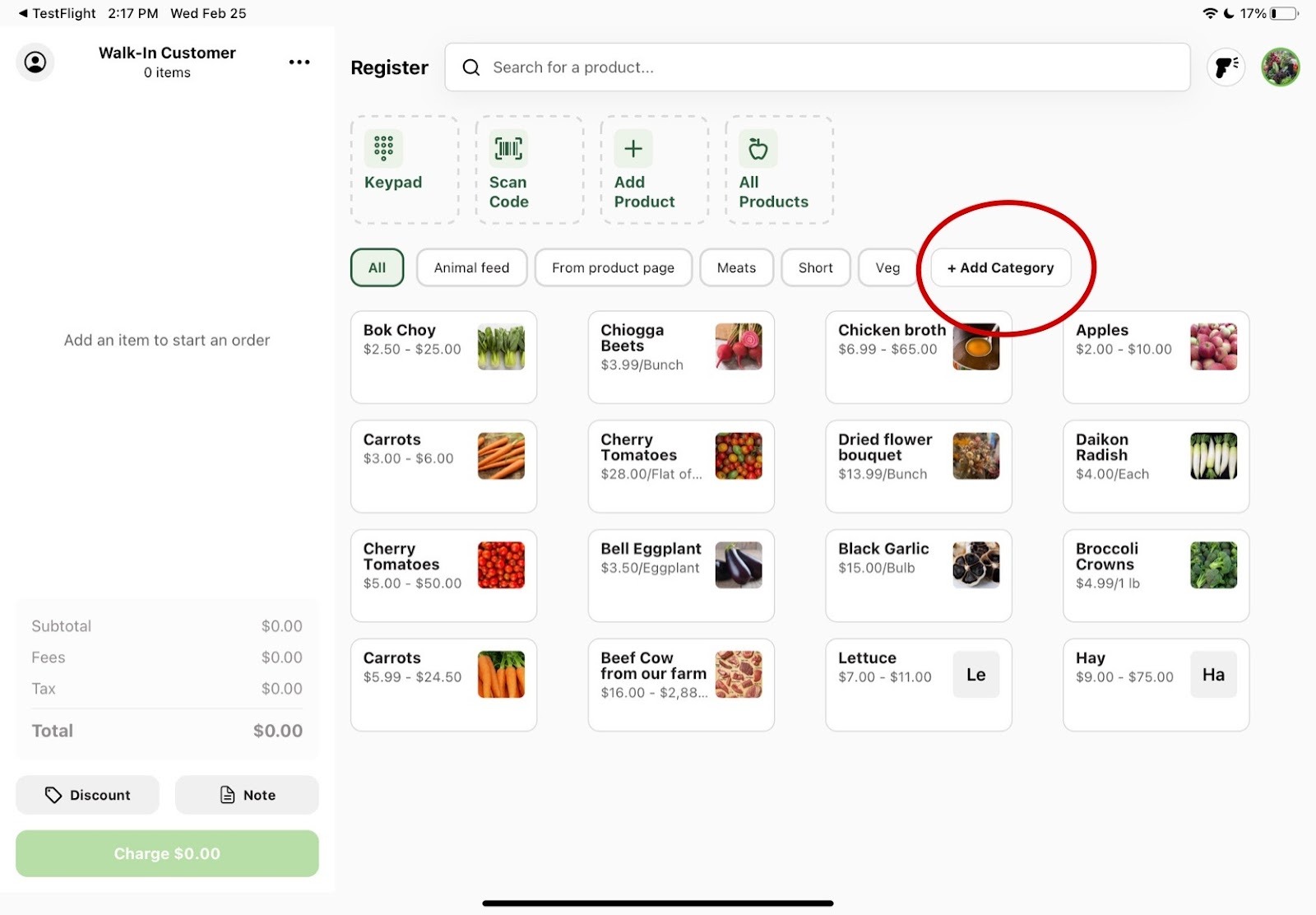 On the home screen, click on “+ Add Category”. You will then be prompted to add a name of the category and choose which product catalog you want to include this category in. After selecting your options, click the green “Create Category” button. Your new category will show up on the register home screen and you can add new products into it after clicking into the category and pressing “Add Product”.