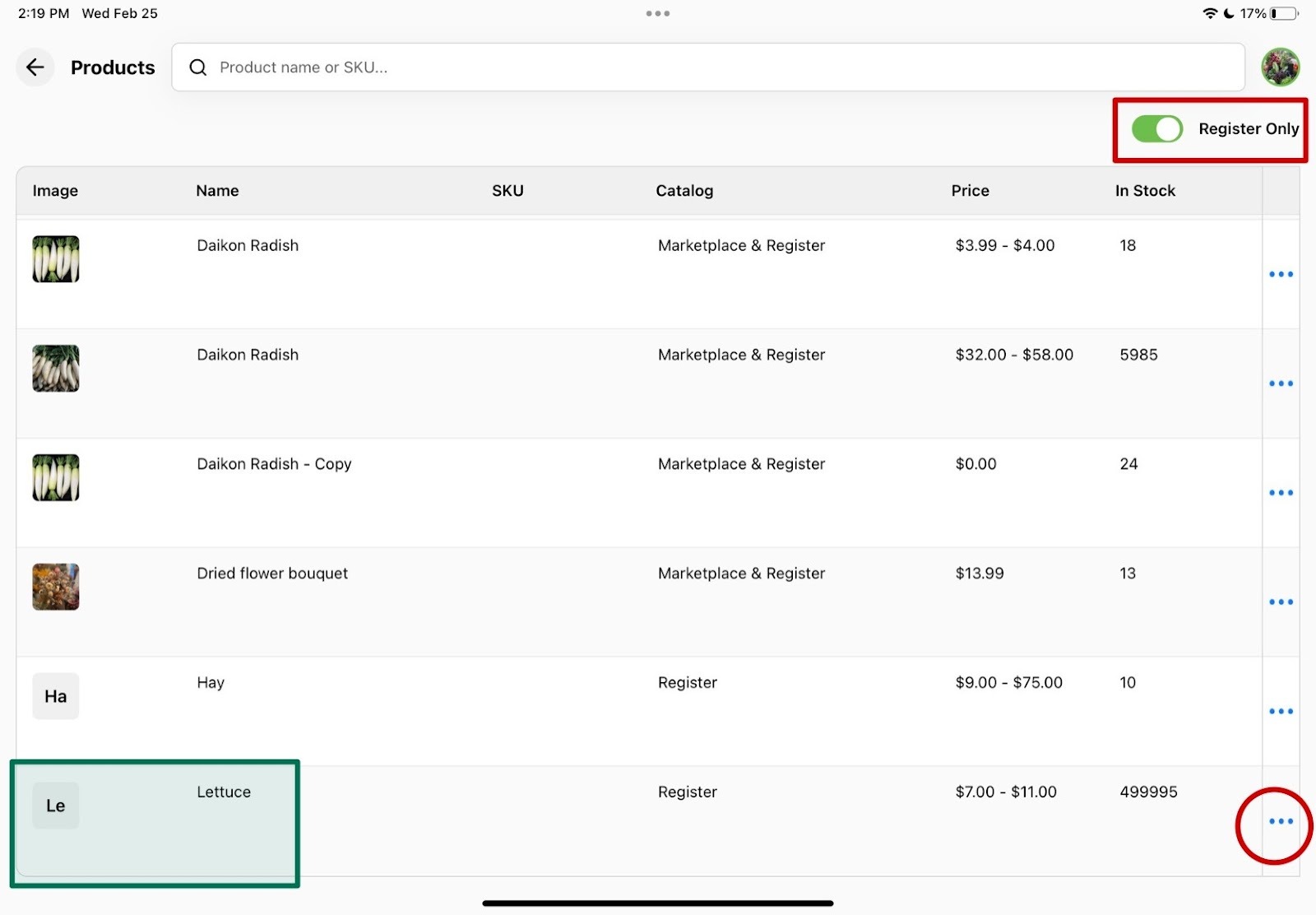 From there, turn on the Register only switch in the top right. Find the product(s) you want to put into the new category and press the three dots to the far right of the item name.