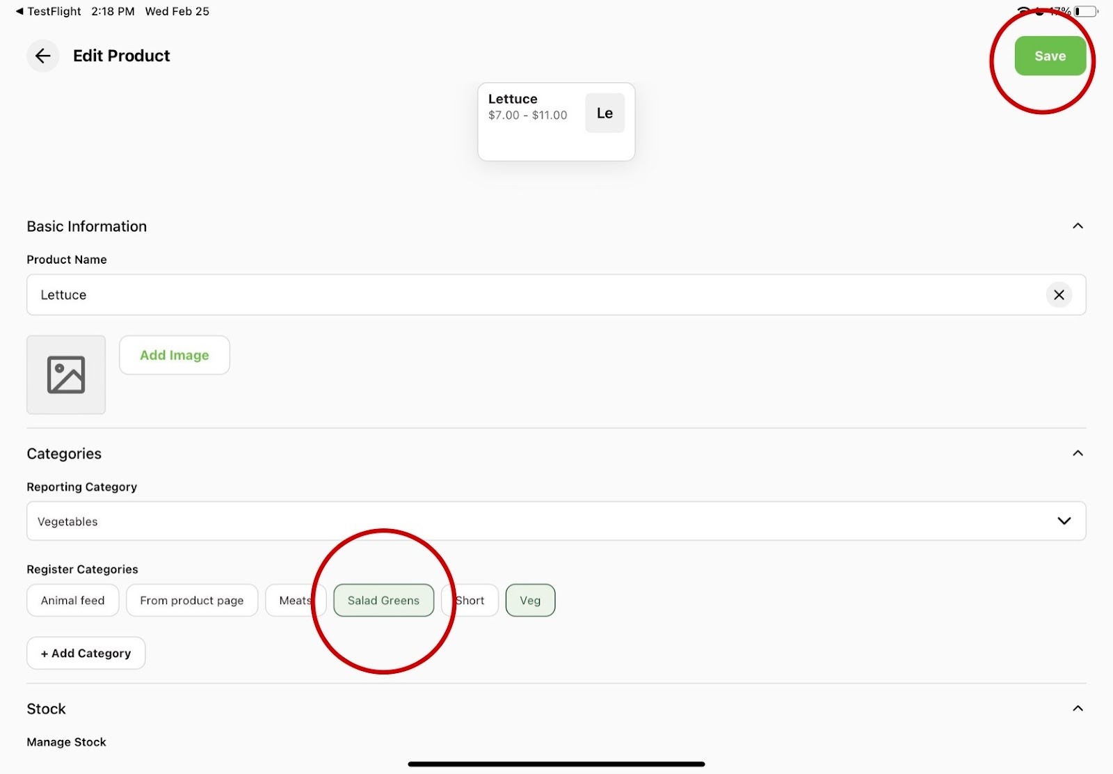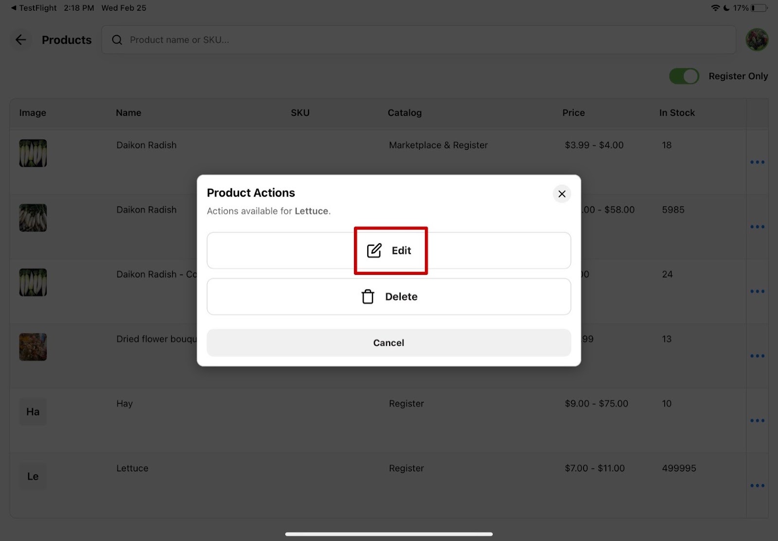 You can also add existing products into this category by clicking on your farm logo at the top right corner of the home screen and selecting the “Products” section from the drop down menu. Turn on the “Register only” switch and only products available on Register will appear. Find what product you’d like to add into the new category or into a different category and click on the three dots all the way to the right. A pop up comes up that asks if you’d like to edit the product or delete the item. Click edit and go down to the “Register Categories” section and click on the category you’d like it to be in. Press the save button in the top right corner and from there navigate back to the register homepage and you can find the product in its new category.
