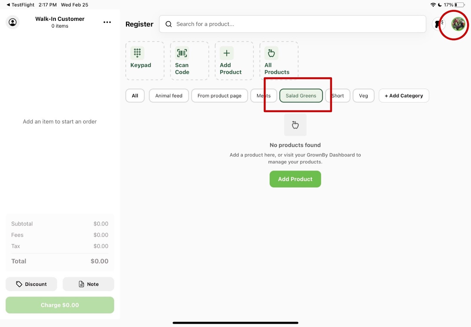 Click on the new category tab on the homepage, and it will say “No products found”. If adding a new product entirely you can click on the green “Add Product” button. But if you’d like to add existing products into the category click on the profile icon in the top right corner.