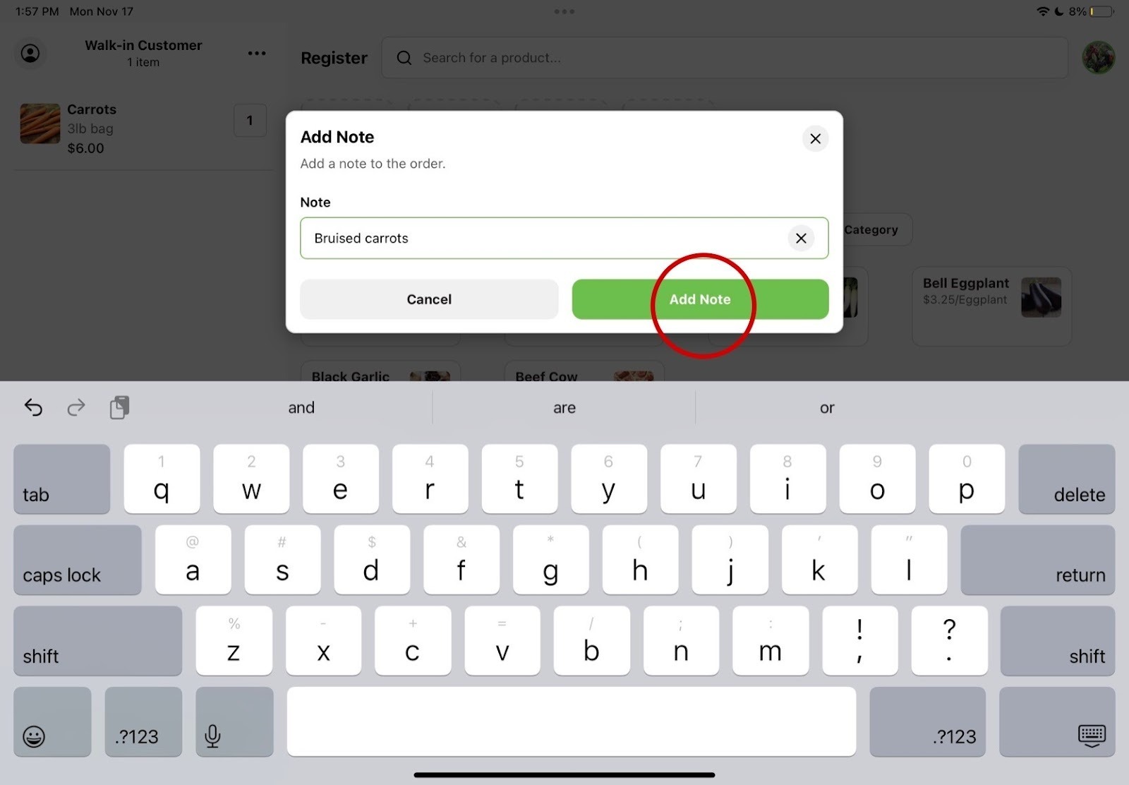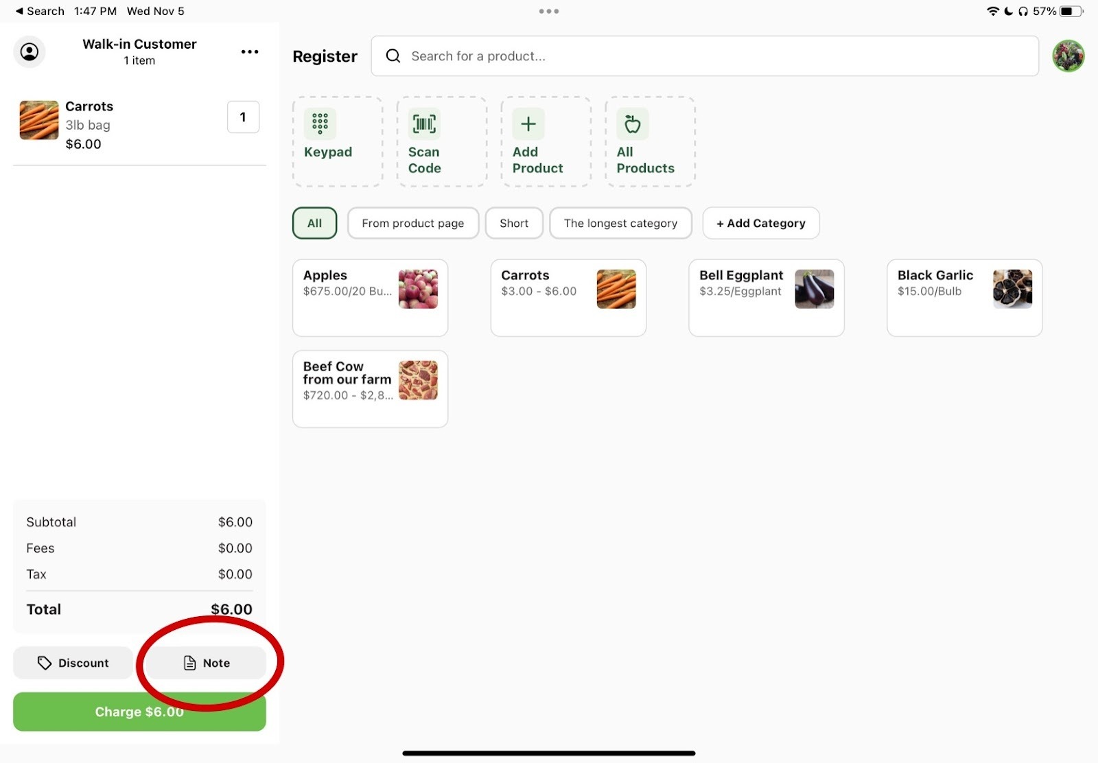After adding your customer's products to the cart, you can select “Note”, above the charge button, and add in a small note about the order. You will then be prompted to enter in a note for the order and when you are finished, click “Add Note” on the right. The note will then be reflected in the order and you will see the Note button highlighted in the order.