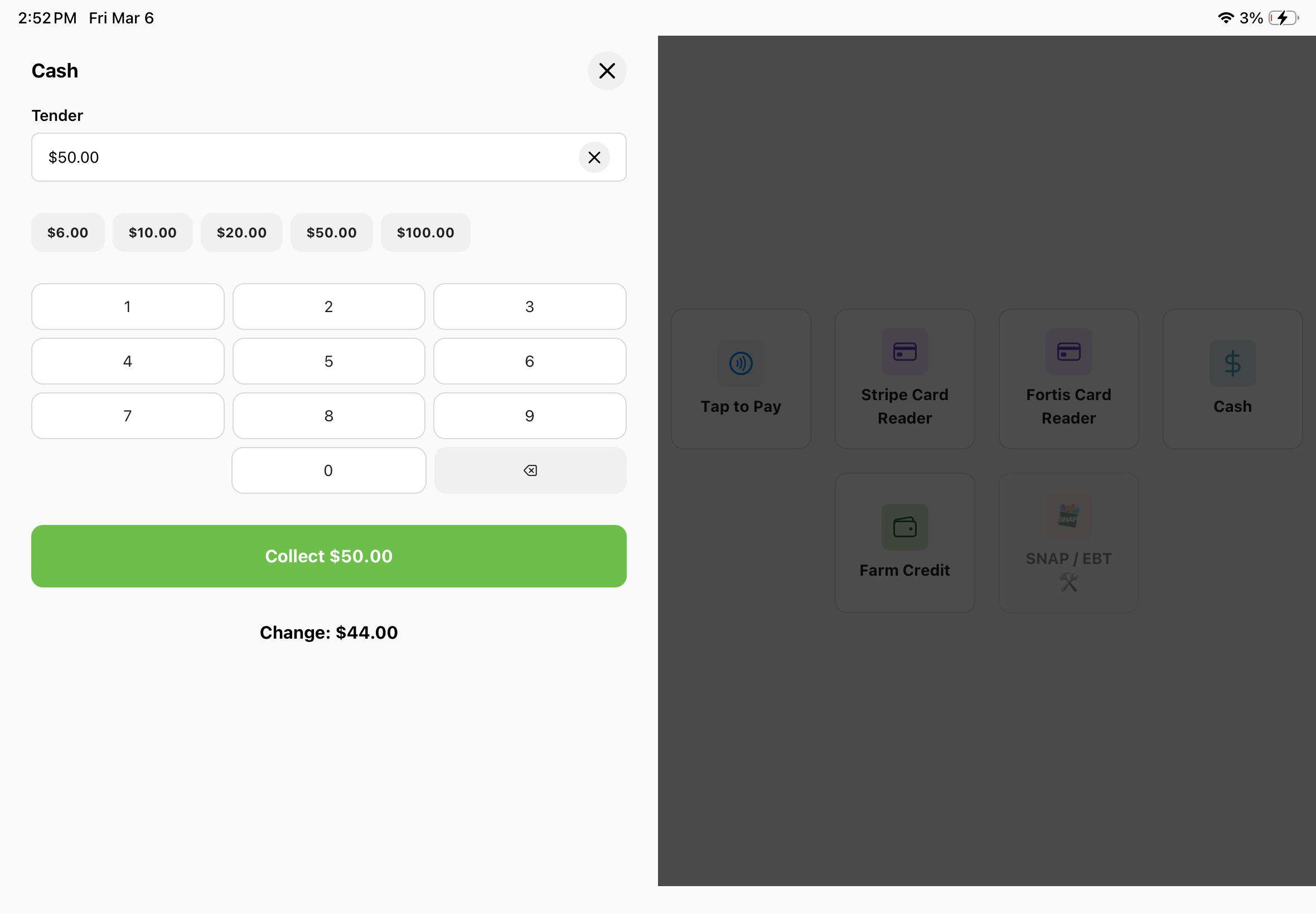 When receiving a cash payment, the cash drawer (if connected properly) will pop open automatically after "Collect" is pressed on this screen