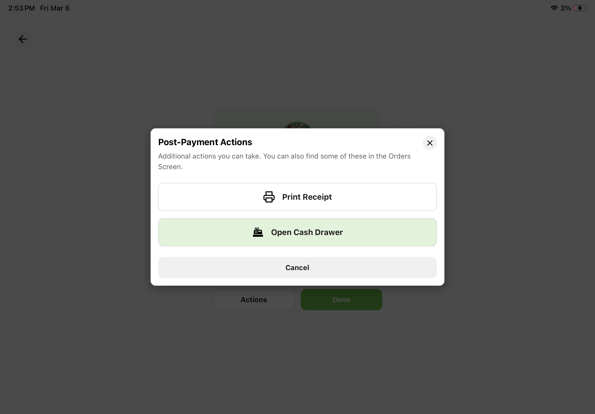 Additionally, you can always open the cash drawer as a post-payment option. Click "Actions" on the order completion screen and then "Open Cash Drawer"