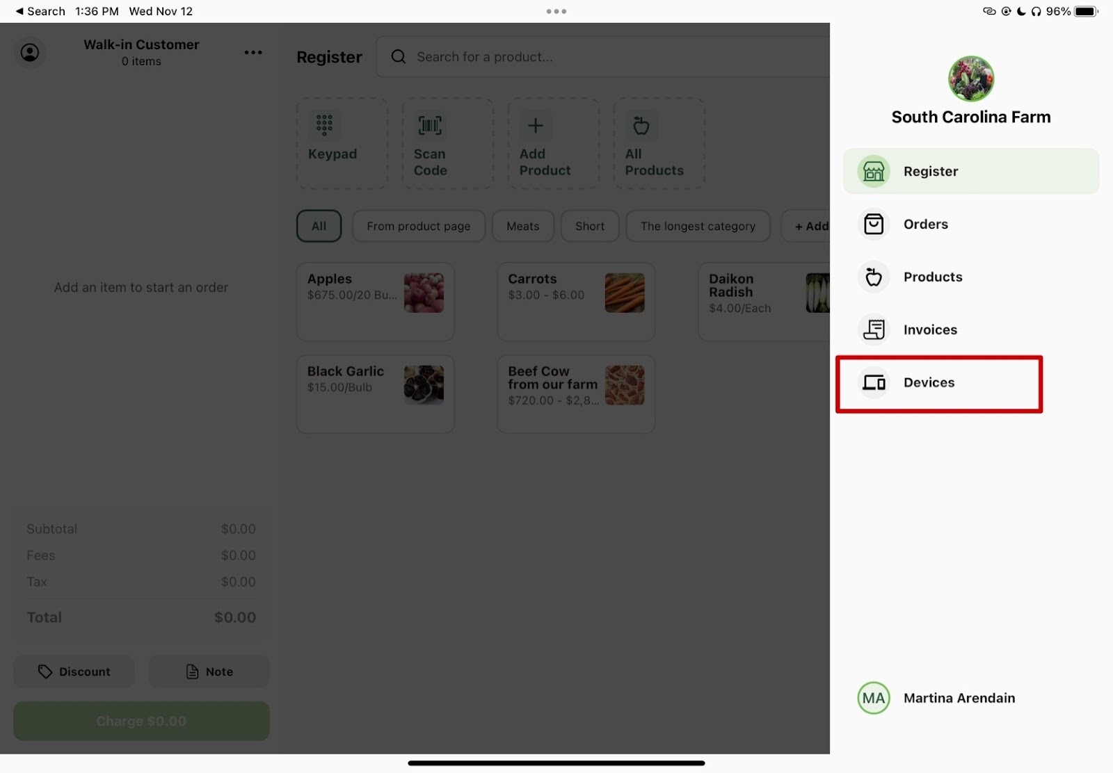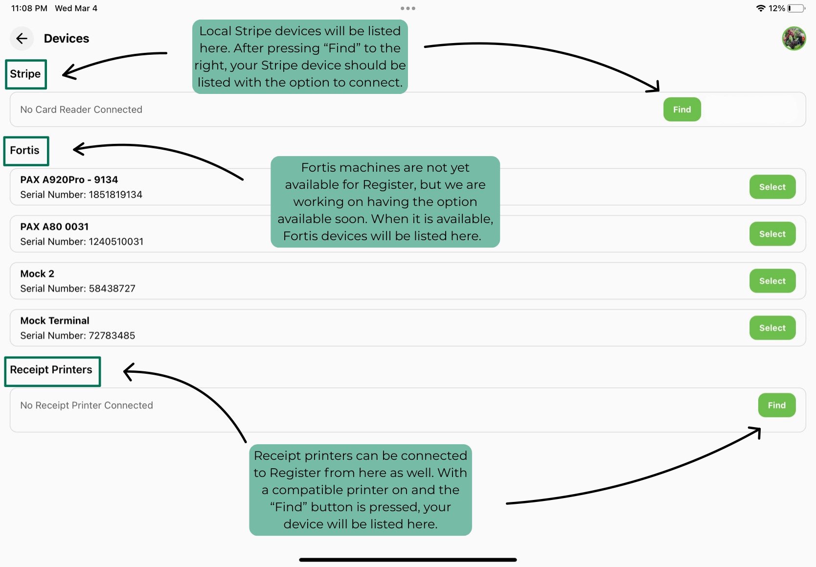 On the Devices screen, you will be able to connect different devices to aid in using the Register app. There is a section for connecting Stripe payment devices. Once your Stripe device is on, first connect it to Bluetooth in your device settings and then press the "Find" button listed to the right of the Stripe devices section. It should automatically list the available Stripe readers connected to your device. There is also an identical section for Fortis payment devices but we are not set up to use Fortis yet. Similar to finding a Stripe device, printer devices may be connected to the Register device using the same instructions.