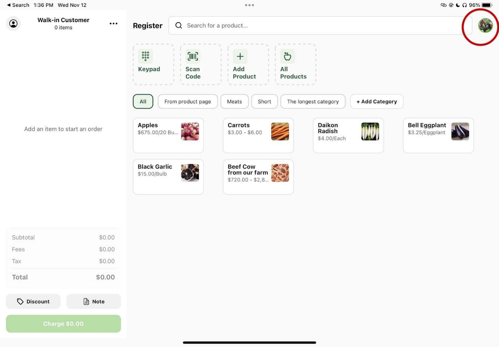 Products Screen on Register Finding the Products Page First, to access the Products screen on Register, click on the account icon in the top right corner of the starting screen. From the drop down menu, select “Products”. Looking at the annotated ...