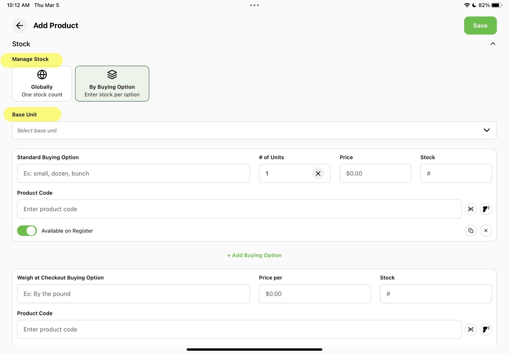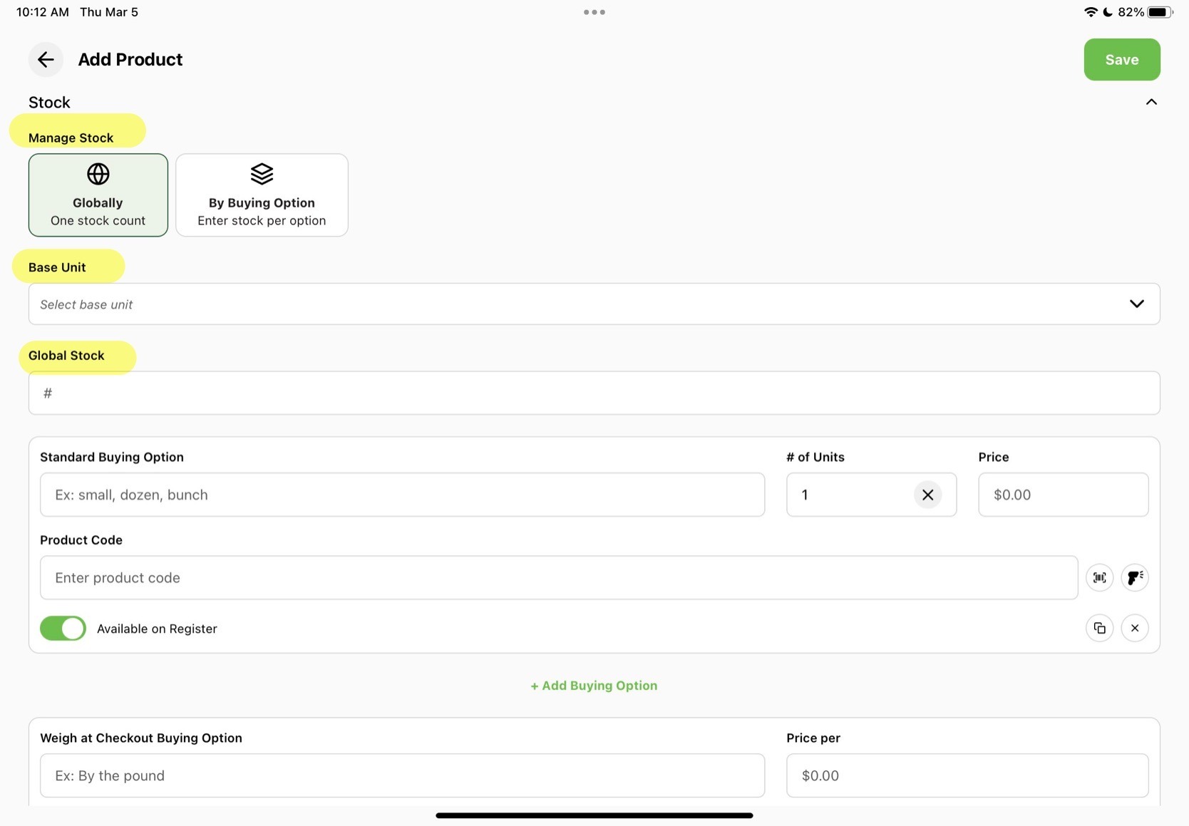 There will be a prompt for how you would like to organize your stock, either globally or by buying option. Depending on how you’d like your product to be sold, through your global stock or a set stock for the register accounts. You also have the option to make purchases decided by weight at checkout.