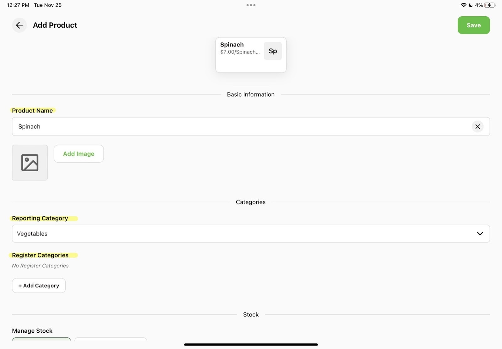 You will then be on a new screen that you can use to enter details about the product you would like to add. There are reporting categories for financial organization and register categories you can sort your product into to organize the register home screen.