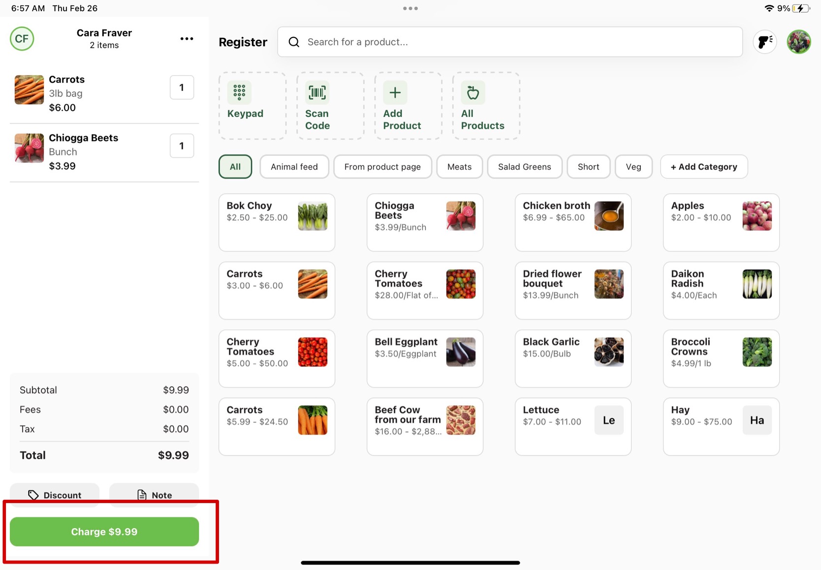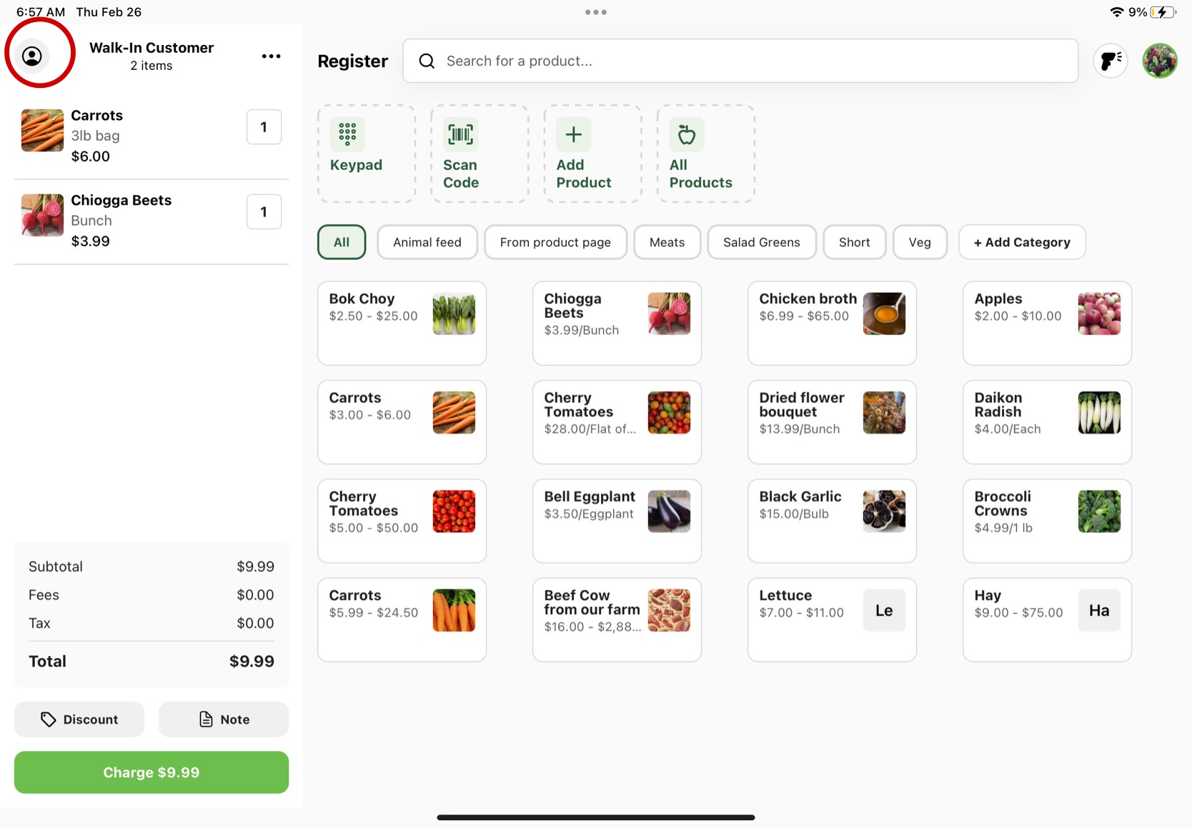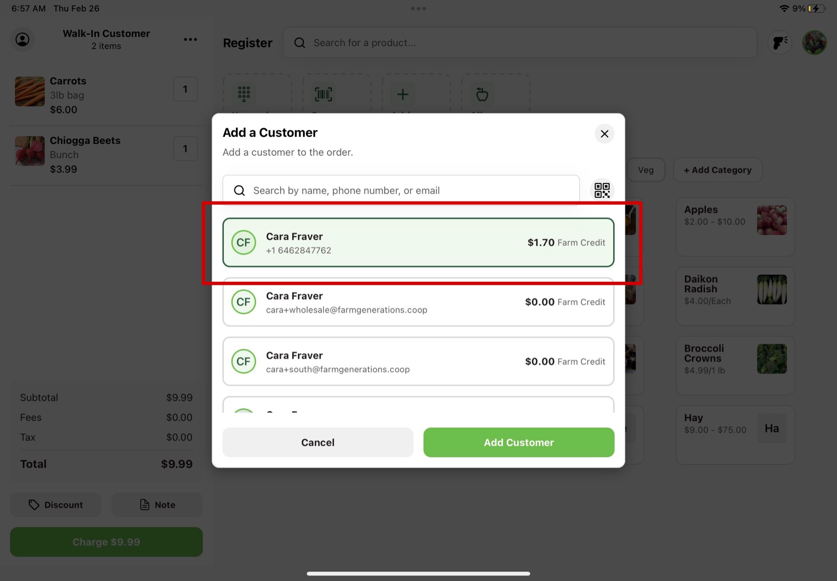 To use the Farm Credit for a Register order, the customer must be connected to their basket. To add a customer to the order, press the person icon in the top left of the basket. From there, search the customer you are looking for or scan their GrownBy QR code using the QR code icon to the right of the search bar. When you find your customer, click on their contact and press "Add Customer". Continue on the check out process and press the green "Charge" button.