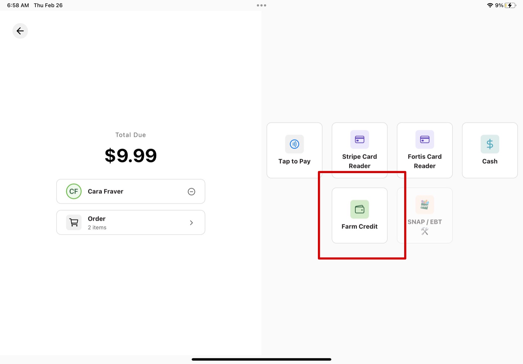 6. The farm credit and new total will apply and you need to choose one of the 5 other processing options for the customer to finish paying.
