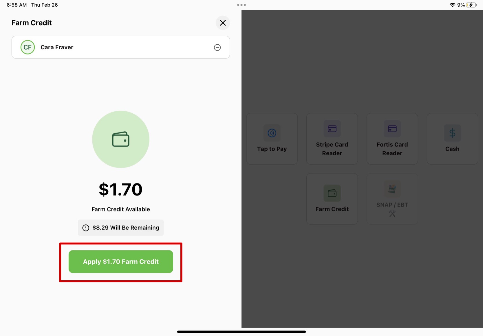 5. It will show the available Farm Credit from your customer and how much will be remaining on the total they will pay today if they use it. If they choose to use it, press the green "Apply Farm Credit" button.