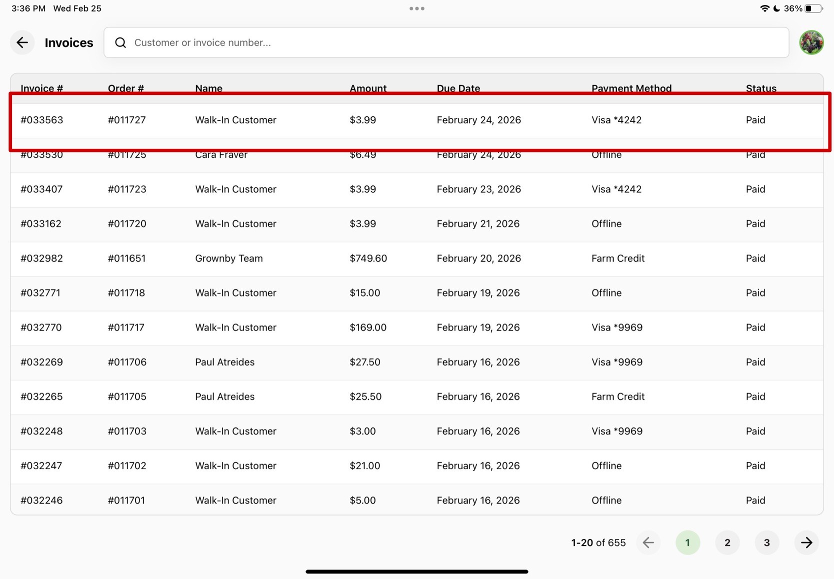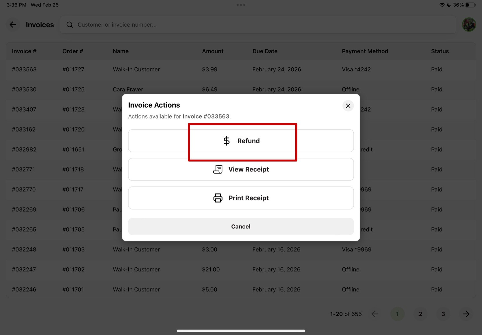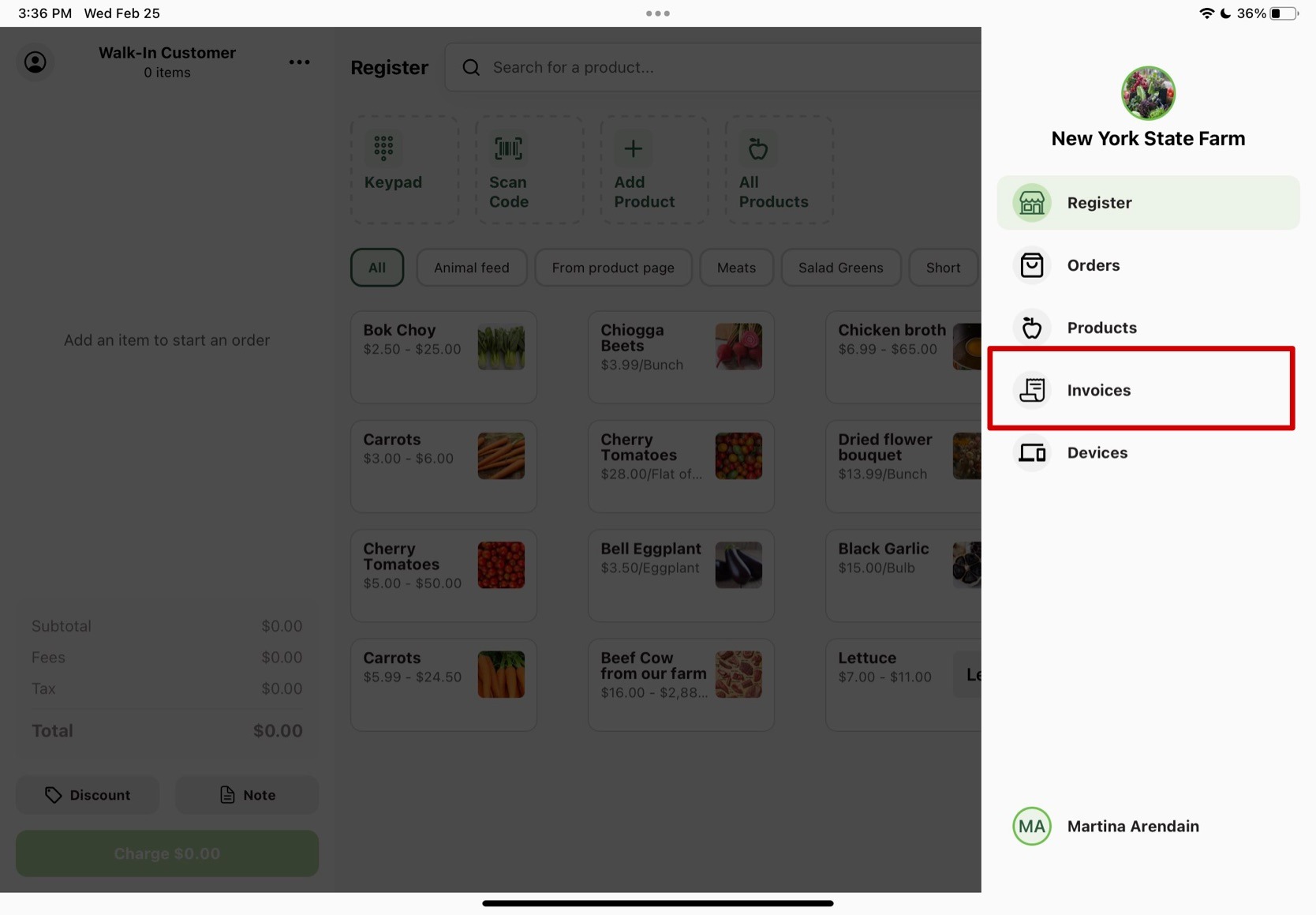 You can start to refund an order on Register by going to the Invoices page. Click on the profile logo in the top right corner of the starting page. Click on “Invoices” in the drop down menu, and find the order you want to refund. You can look it up by customer name or invoice number, or the invoices should be listed by most recent purchase.