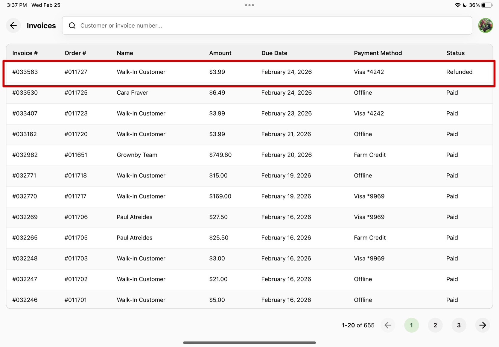 To confirm the Invoices page should update and reflect that order as “Refunded” under the Status column.