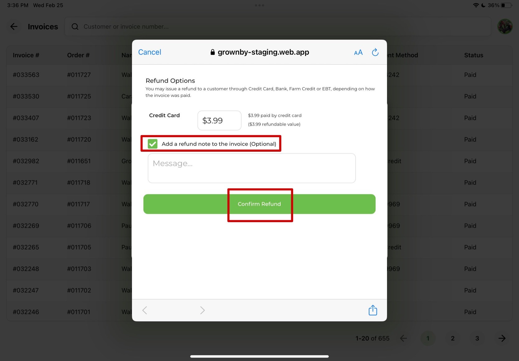 When you find the order, click on the order. A window for Invoice Actions appear and press on “Refund”. From there a browser pop up will appear and youmay be asked to log back into GrownBy, but it typically will recognize your account and take you straight to the refund page.