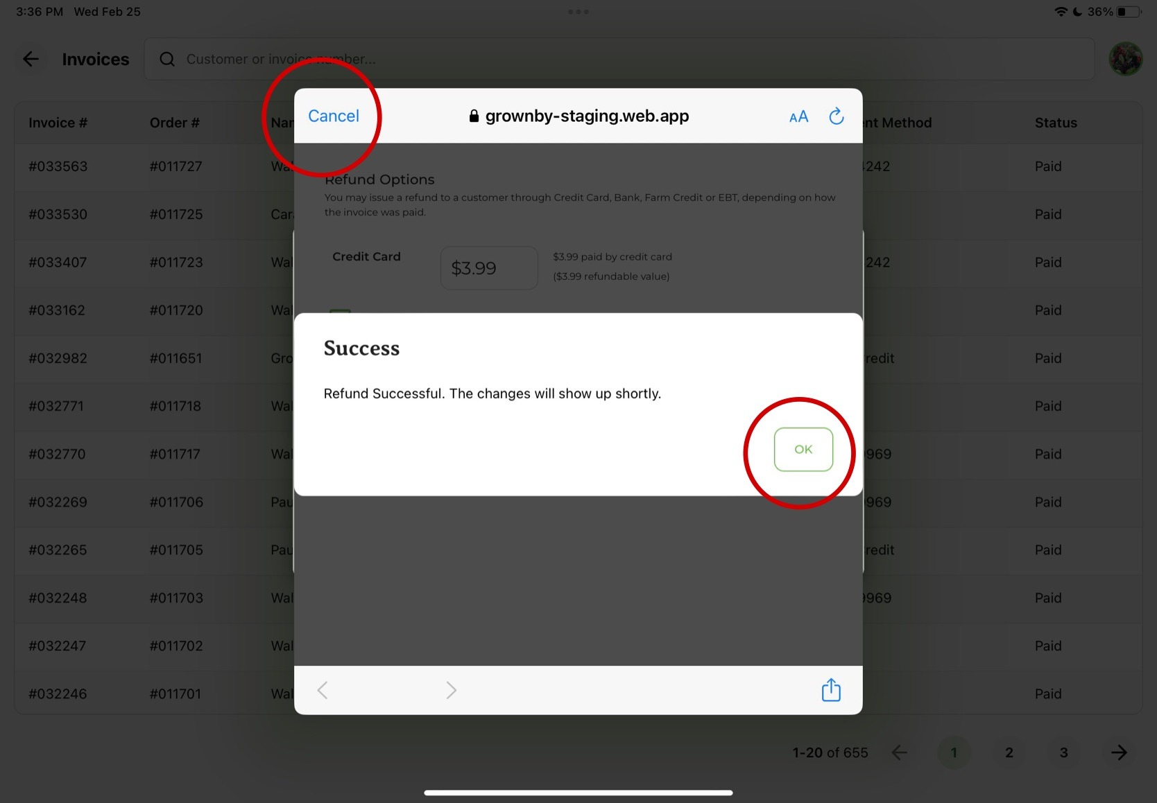 After entering this information, click on “Confirm Refund” and you should see a pop up window that says “Success!”. Exit out of the screen by pressing “Cancel” in the top left corner of the pop up window.