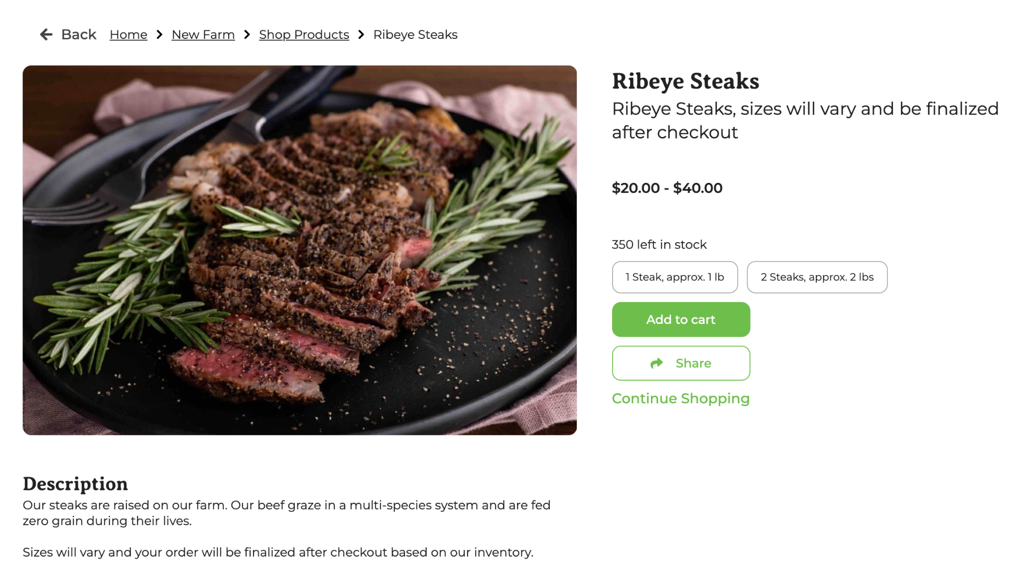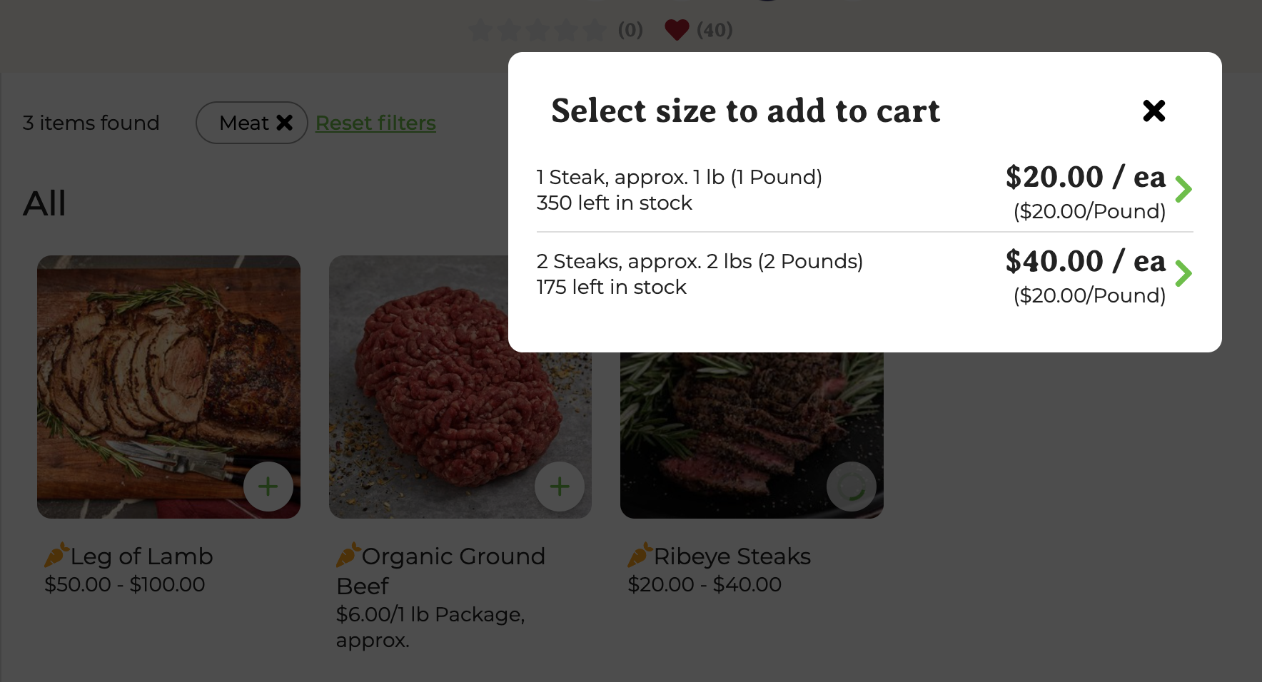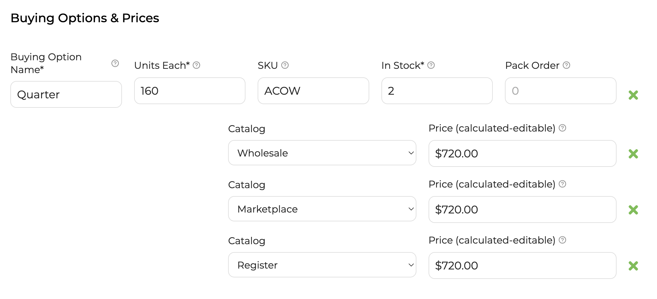3. Buying Options - Next, enter each buying option. You may just have one if all of your cuts for a given product are around the same size. In the example below, the farmer is selling a quarter animal. That animal is estimated to weight 160 lbs and they have 2 in stock. Also in this example, the price for the quarter is the same across all catalogs.