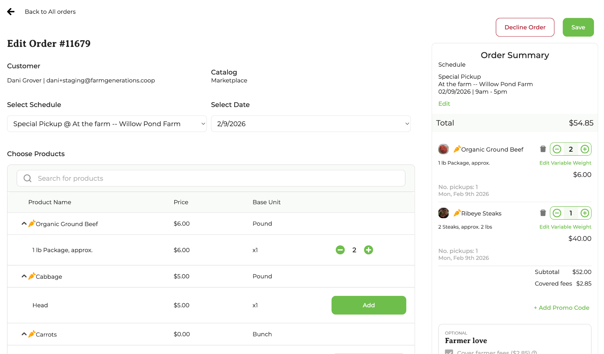 Click on the Order Number of the Action to view the Order Detail Screen. From here, you can Decline Order, Edit Order, or Fulfill Order: