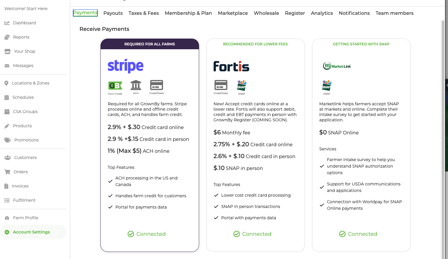 As of 2026, GrownBy is offering farms a connection to Fortis for more affordable online payments and Register EBT payments (COMING SOON). After you setup with Stripe, you may want to consider adding Fortis to your account. Simply follow their onboarding link and then complete the required forms. As soon as you are setup in Fortis, GrownBy will process your payments through their service at the advertised rates.