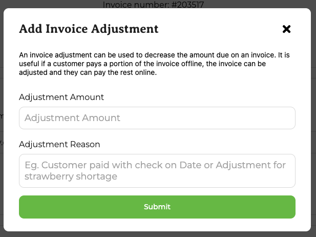 The Add Invoice Adjustment pop-up looks like this: