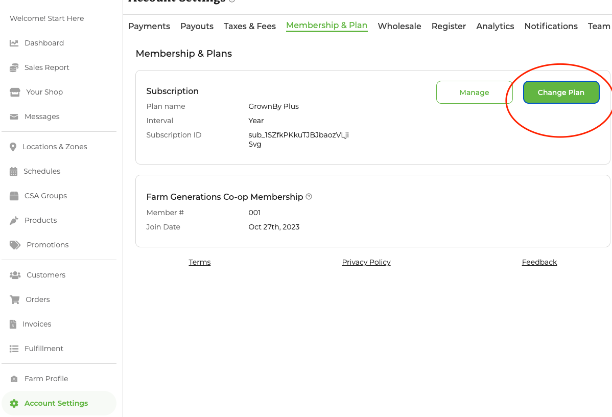 Existing farms should visit Account Settings → Membership & Plan → Change Plan
