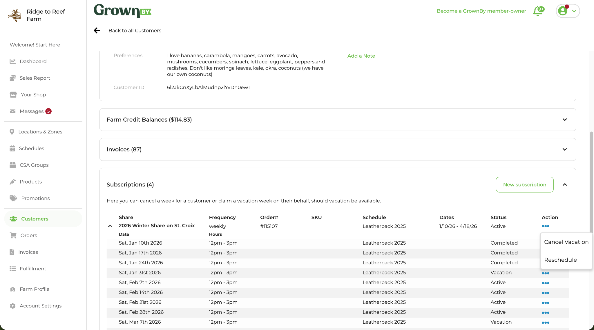 Farmers can view or make changes to the vacation weeks claimed by a customer in the customer's detail page. The farmer can claim a vacation week for a customer AFTER the change window closes. The farmer can cancel a claimed vacation for a customer. The farmer will receive a notification that a customer has claimed a vacation week at the time that the customer claims the week. That customer will not show up on the PDF sign in sheet. The farmer can also filter the sign in sheet in HTML and csv for customers who have claimed vacation in a given time frame. The app-based sign in sheet feature also shows customers who are on vacation. The location summary and daily summary will reflect this missing share.